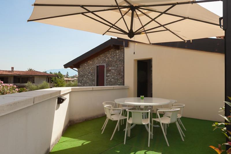 Terrasse exclusive de 375 m² (vue château) avec 120 m² de gazon, avec table, chaises, parasol et barbecue réservés.