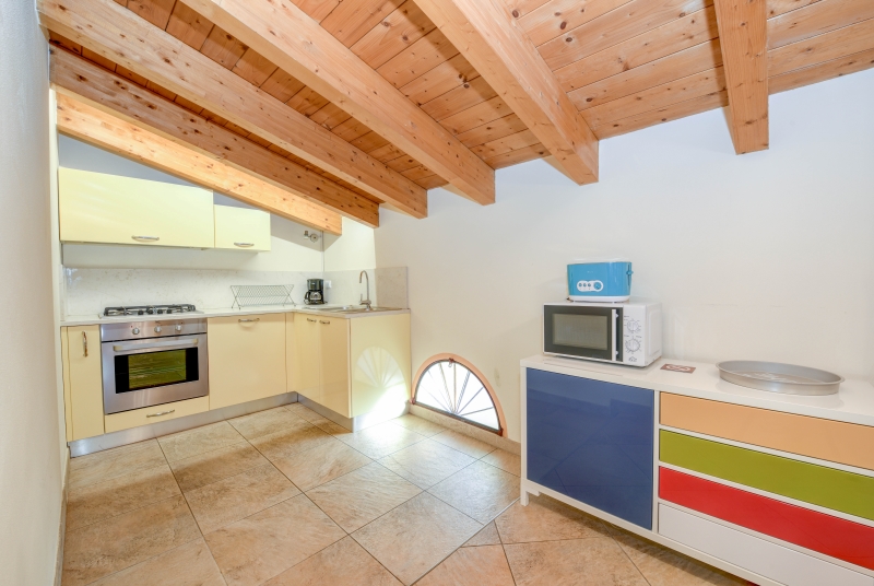 Ampio soggiorno climatizzato con cucina integrata, fornita di frigorifero, fornelli, forno, lavastoviglie, stoviglie, lavatrice, Tv-Sat e lettore DVD, asciugacapelli, biancheria bagno e letto.